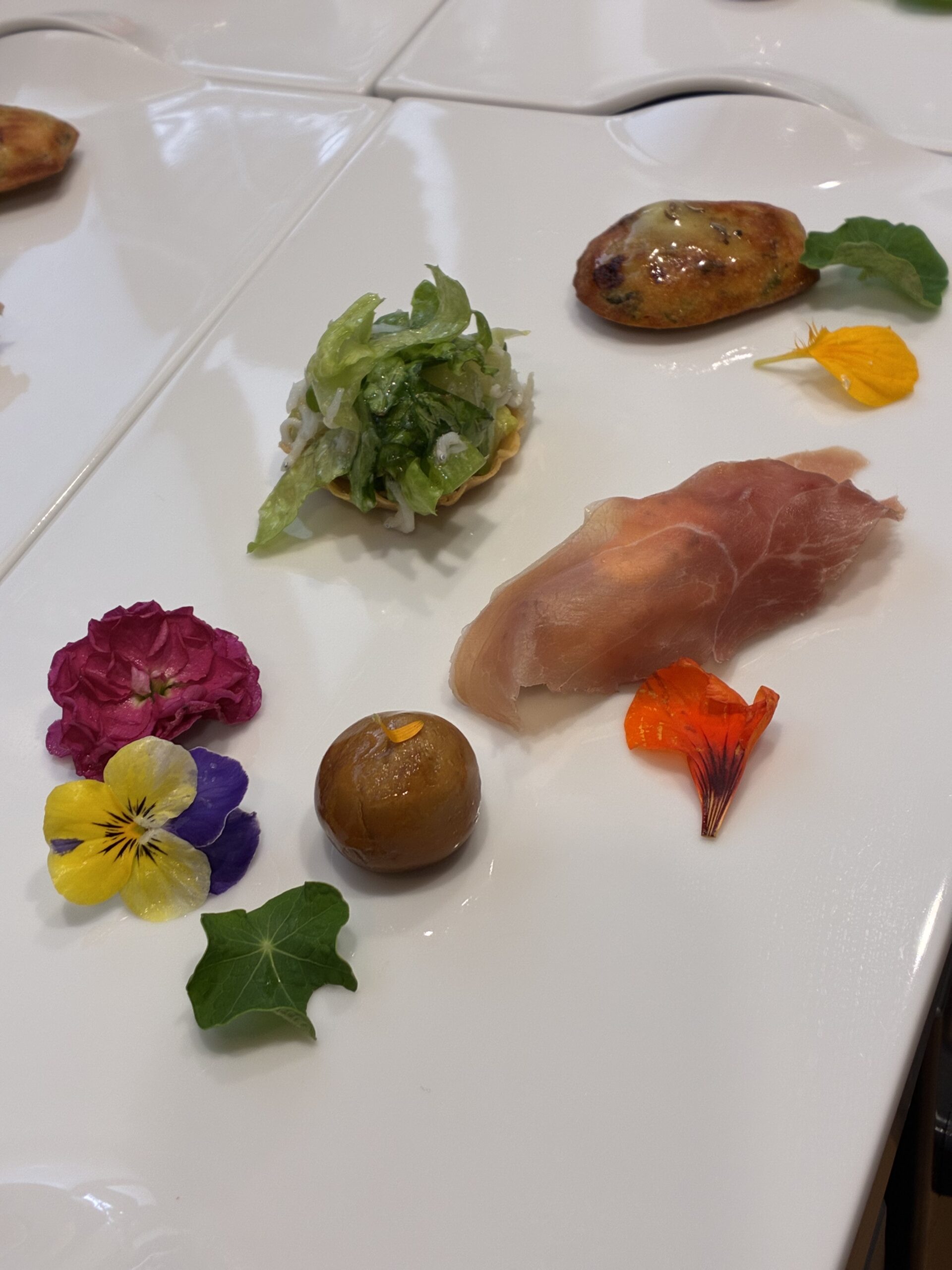 幕開けは、濃厚でなめらかなフォアグラ 八ヶ岳プロシュート、しらすと茎レタス、帆立と芹、オニオンヌーボーなど、春の息吹を繊細に映した前菜を。