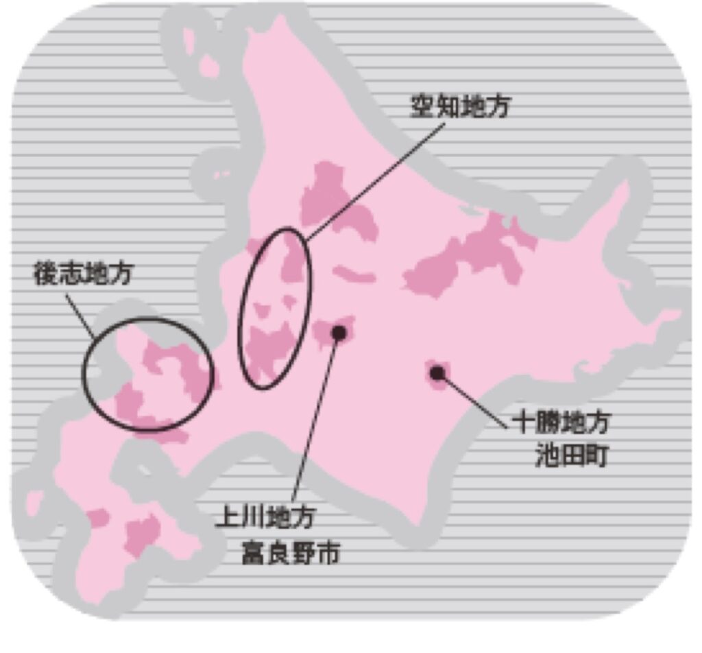 👉 空知(そらち)地方:石狩平野南部の丘陵地帯。浦臼町・岩見沢市・三笠市などで栽培。かつて主流だったケルナーは減少し、ピノ・ノワールやソーヴィニヨン・ブランが増加傾向。