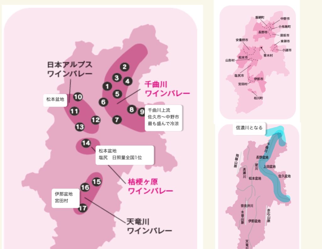 • 桔梗ヶ原:標高700〜800m、世界的に評価の高いメルローの銘醸地。