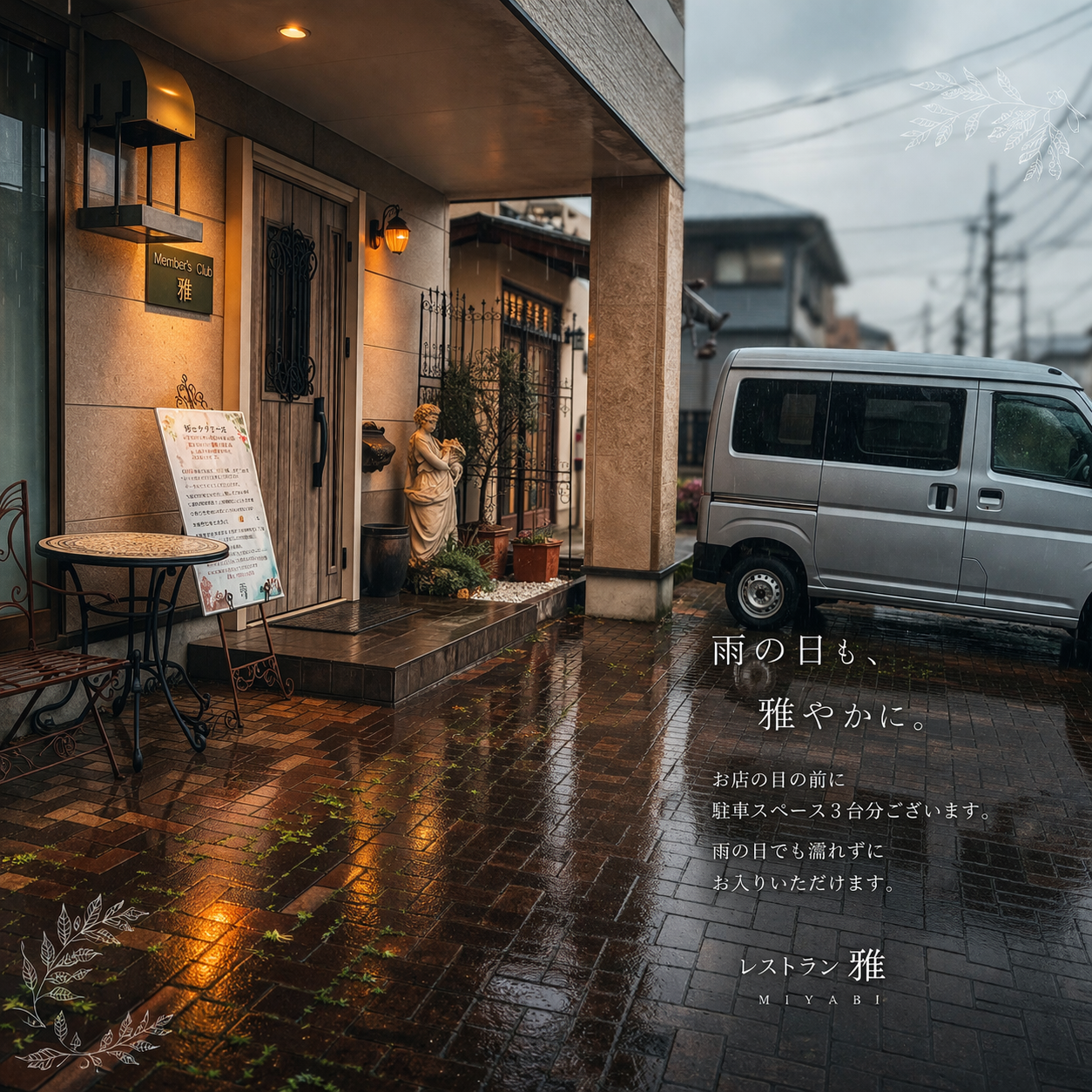 レストラン雅では、お店の目の前に駐車スペースを3台分ご用意しております。